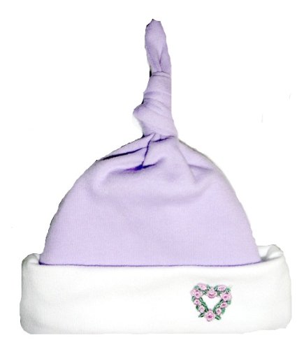 Very sweet hat for your little girl.Very soft, 100% cotton interlock knit.Lavender knotted hat with white brim and lavender heart applique.Five premature infant and newborn baby sizes!Micro preemie 0-3 pounds; small preemie 3-6 pounds;small infant 5-8 pounds; newborn 8-12 pounds and3-6 months to 16 pounds. Please select when ordering.By Jacqui's Preemie Pride Read more...