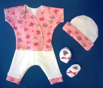 Adorable! 100% soft cotton interlock knit Pink short sleeve t-shirt with butterfly, flowers and tiny white dot print. Opens flat! Velcro closures on shoulders and front for easy access. White pants with pink butterfly and flowers trim on hem. Adjustable velcro closure on waist. Matching white hat with pink butterfly and flowers print on brim. Matching white booties with print on sole and dark pink bow with pearl heart on front of bootie. Four sizes! micro preemie 0-3 pounds; small preemie 3-6 pounds; small infant 5-8 pounds and newborn 8-12 pounds. Please select when ordering. By Jacqui's Preemie Pride Read more...