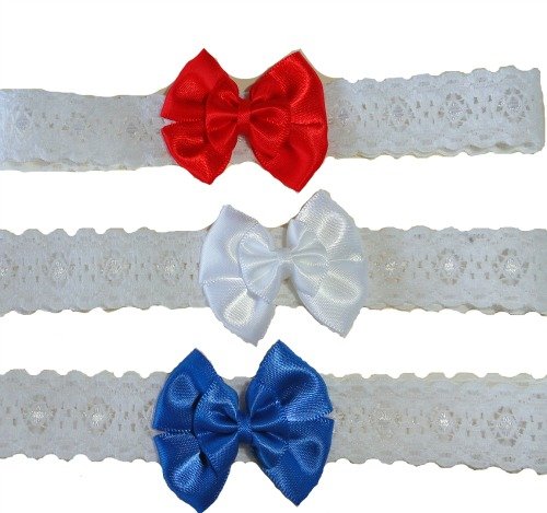 Very Sweet!Soft stretchy lace headbands sized for small infantsSet of three with red, white and blue double bows.Four premature infant and newborn baby sizes:micro preemie 0-3 pounds; small preemie 3-6 pounds;small infant 5-8 pounds or newborn 0-3 months to 12 pounds.By Jacqui's Preemie Pride Read more...