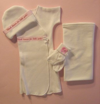 Adorable and so sweet! Four piece set. White short sleeve gown with velcro closures and Thank Heaven for Little Girls trim on front (Available with open shoulders with velcro closures for infants with i.v.'s and pipe lines), Matching hat and white receiving blanket. White booties with pink bow. Four sizes: 0-3; 3-6; 5-8 or 8-12 pounds. By Jacqui's Preemie Pride Read more...