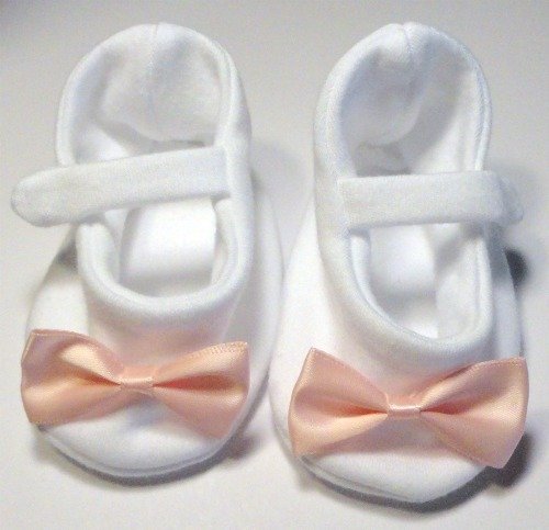 Very sweet and sized for the smallest of infants.Soft cotton interlock knitWhite shoes with adjustable velcro strap.Light pink bow tie on toe.Four premature infant and newborn baby sizes:micro preemie 0-3 pounds; small preemie 3-6 pounds;small infant 5-8 pounds and newborn 8-12 pounds.Please select when ordering.Designed by Jordan Williamsexclusively for Jacqui's Preemie Pride Read more...