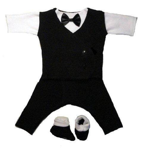 Perfect for your little man! 100% soft cotton knit.White long sleeve shirt with soft velcro closures on back for easy on/off access.Black bow tie on collar.Sleeveless black vest with velcro closure and black faux buttons.Black pants with velcro waist for a soft, adjustable fit.Black booties lined in white (look like socks!).Five sizes! Tiny infant under 1.5 pounds; micro preemie 0-3 pounds;small preemie 3-6 pounds;small infant 5-8 pounds and newborn boys 8-12 pounds.By Jacqui's Preemie Pride Read more...