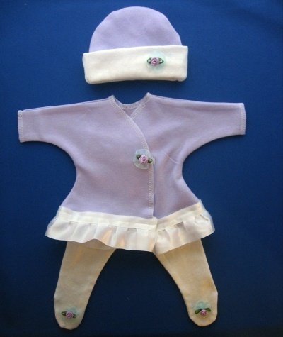 Too Cute! Beautiful! Very sweet and sized for small infants! 100% soft cotton knit. Long sleeve lavender swing dress with white lace with lavender rose center on front. Velcro closure on front for easy access. Matching hat with white pointelle brim and matching bow. White pointelle tights with matching bow on toes. Velcro closure at waist for soft, adjustable fit. Four preemie and newborn sizes! Starting with micro preemie dress 0-3 pounds; small preemie 3-6 pounds; small infant 5-8 pounds and newborn 8-12 pounds. Please select when ordering. By Jacqui's Preemie Pride Read more...