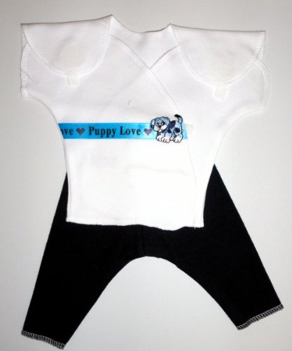 Very cute! 100% soft cotton knit.Short sleeve shirt with Velcro closures on shouldersand front for easy on/off access.Blue trim across front with "Puppy Love" and hearts.Blue puppy dog applique.Navy blue pants with adjustable velcro closure at waist for easy access.Four premature infant and newborn baby sizes:micro preemie 0-3 pounds; small preemie 3-6 pounds;small infant 5-8 pounds or newborn 0-3 months to 12 pounds.By Jacqui's Preemie Pride Read more...
