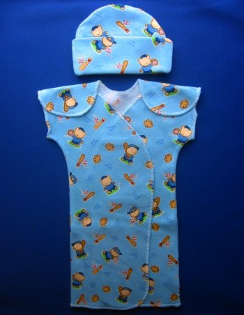 Perfect for babies in the NICU and hospital. Very soft, cute gown made of 100% cotton interlock. Extra long, open at bottom for wires and monitoring. Velcro closures on front, shoulders for easy on/off access. Light blue with teddy bears, baseballs and bat print throughout. Comes with matching hat. Four sizes! 0-3; 3-6; 5-8 and 8-12 pounds. By Jacqui's Preemie Pride Read more...