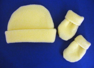 Very warm and soft! Light yellow polar fleece hat and mittens set. Three sizes: small preemie 3-6 pounds; small infant 5-8 pounds and newborn 8-12 pounds. By Jacqui's Preemie Pride Read more...