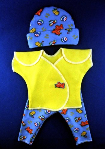 Very Cute 100% soft cotton knit Bright yellow short sleeve shirt with airplane applique on front. Velcro closures for easy on/off access. Open shoulders with velcro closures for infants with i.v. or picc lines. Light blue pants with airplanes, ducks, blocks toys, etc., print. with velcro closure for soft adjustable, easy on/off access. Matching hat with my toys print. Fits infants micro preemie 0-3 pounds; small preemie 3-6 pounds; small infant 5-8 pounds and newborn 8-12 pounds. By Jacqui's Preemie Pride. Read more...
