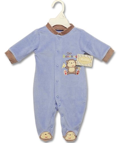 Baby Starters adorable one piece coverall is great for baby boys to wear everyday. Soft and cozy velour fabric with novelty monkey applique on the front and feet are what makes this an item you and your baby will go banana's over.Front snap closures make dressing and diaper changes easy, and the built in feet are designed to keep her little toes toasty warm.
