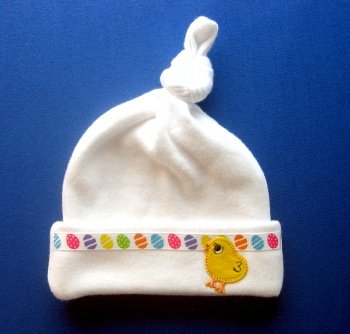 Adorable! 100% soft cotton knit. White knotted hat with multi colored Easter egg trim and a yellow baby chick applique. Four sizes! 0-3; 3-6; 5-8 and 8-12 pounds. By Jacqui's Preemie Pride Read more...
