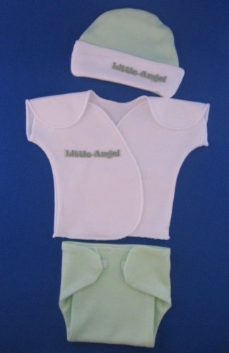 Very Sweet! Soft 100% soft cotton interlock knit. White t-shirt opens flat for infants with wires and easy dressing Velcro shoulders and front for easy access Light green "Little Angel" applique on front. White hat with light green brim. Light green diaper cover opens flat with adjustable velcro waist. Sized for the smallest of infants. Four sizes: micro preemie 0-3 pounds; small preemie 3-6 pounds; small infant 5-8 pounds or newborn 8-12 pounds. Please select size when ordering. By Jacqui's Preemie Pride Read more...