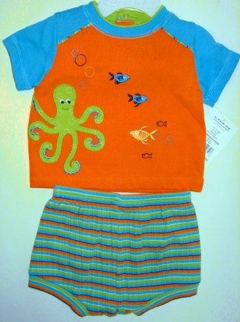 Two piece set. Bright orange short sleeve shirt with light blue shoulders and collar. Fish and Octopus appliques on front. Green, orange, blue and white striped ribbed diaper cover. Fits infants 8-12 pounds. By Little Me. Read more...