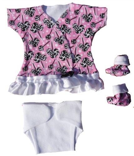 Too Cute!100% soft cotton interlock knitPink sassy dress with white aand black lollipop print throughout.White satin flounce on hem with black bow.Velcro closures for easy access.Available with open shoulders for infants with iv and picc lines.White diaper cover opens flat with velcro closures of soft adjustable fit.Matching booties!Four premature infant and newborn baby sizes:micro preemie 0-3 pounds; small preemie 3-6 pounds;small infant 5-8 pounds or newborn 0-3 months to 12 pounds.By Jacqui's Preemie Pride Read more...