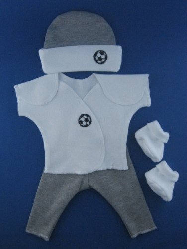 100% soft cotton interlock knit White short sleeve t-shirt with soccer ball applique on front Velcro closures for easy on/off access. Open shoulders with velcro closures for infants with i.v. or picc lines. Heather gray pants, with velcro closures for soft adjustable, easy on/off access. Soft heather gray hat with white brim and soccer ball applique. Soft white booties. Fits infants micro preemie 0-3 pounds; small preemie 3-6 pounds; small infant 5-8 pounds and newborn 8-12 pounds. By Jacqui's Preemie Pride. Read more...