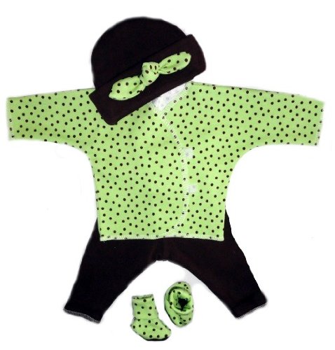 Too cute! 100% soft cotton knit.Light green long sleeve shirt with velcro closure onfront for easy on/off access.Tiny brown dots throughout.Brown pants with velcro closure at waist for adjustable fit.Matching brown hat with polka dot bow on brim.Green with brown dot booties with brown knit on sole.Four premature infant and newborn baby sizes:micro preemie 0-3 pounds; small preemie 3-6 pounds;small infant 5-8 pounds or newborn 0-3 months to 12 pounds.By Jacqui's Preemie Pride Read more...