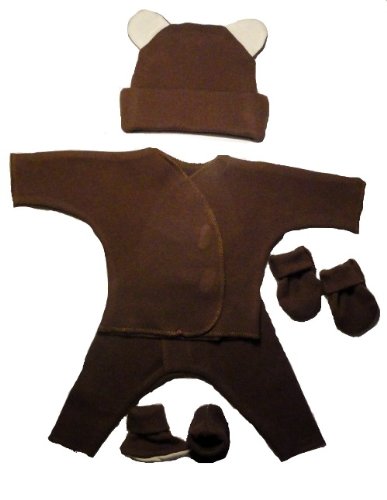 Very Sweet! Made with 100% soft cotton knit. Brown long sleeve shirt with velcro closure on front for easy on/off access. Brown hat with tan ears. Brown pants with velcro closure at waist for adjustable fit. Brown mittens and booties with tan soles. Available in four sizes: micro preemie 0-3 pounds; small preemie 3-6 pounds; small infant 5-8 pounds and newborn 8-12 pounds. By Jacqui's Preemie Pride Read more...