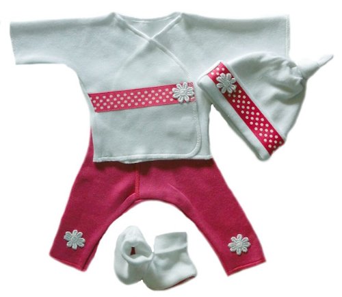 Too Cute!100% soft cotton knit.White long sleeve shirt with velcro closure onfront easy on/off access.Dark pink with white dots trim along frontwith a white daisy applique.Dark pink pants with white daisy applique on hem.Velcro closure at waist for adjustable fit.White knotted hat with matching trim applique.White booties with dark pink on sole.Adorable!!Four NICU premature infant and newborn baby sizes!Micro preemie for babies weighing 0-3 pounds; small preemies 3-6 pounds;small infant 5-8 pounds and newborn 0-3 months to 12 pounds.Please select when ordering.By Jacqui's Preemie Pride Read more...